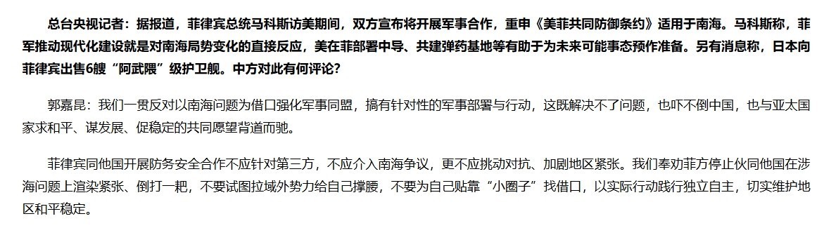 据外交部记者会最新消息,外媒称菲律宾总统马科斯访美期间请求美方明确重申《美菲共同防御条约》适用于南海,也就是一旦菲方遭到“武装攻击”,美军将根据条约规定介入。对此外交部发言人送给菲方一个罕见忠告:“(此举)吓不倒我方”。接着南部战区发布公告,宣布当天组织海空兵力位黄岩岛领海周边海空域开展战备警巡。从南部战区发布的视频来看配资世界门户首页,战区海军至少出动了052D驱逐舰、054A护卫舰、903补给舰配资世界门户首页,空军至少出动了挂载PL-10空对空格斗弹的歼-16战机、同样挂载实弹的苏-30战机,以及挂载鹰击-12超音速反舰导弹的轰-6K轰炸机,阵容可谓相当强大。公告还称,整个7月以来,战区部队组织海空兵力持续加强黄岩岛领海周边海空域巡逻警戒,随时捍卫主权安全,维护南海地区和平稳定。这表明尽管近期媒体未作过多报道,但美菲方面仍在南海小动作不断,因此南部战区才会持续不断地保持高等级战备水平。从军事角度来看,如果仅仅是菲律宾方面挑衅生事,南部战区恐怕不会派出上述强大阵容。菲军主力战机为FA-50战斗教练机、超级巨嘴鸟螺旋桨攻击机,在面对歼-16+PL-10的组合时基本没有还手之力。相反,美军不时派驻菲境内基地的F-16、F-35甚至F-22战机才是更大威胁。海上情况也同样如此。菲方主力战舰综合性能与056A护卫舰相当,052D驱逐舰、054A护卫舰对其堪称“火力过剩”。而美军航母、巡洋舰和驱逐舰不时进入南海乃至黄岩岛附近海域活动,是我方必须认真应对的现实威胁。从外交部和南部战区几乎同一时间发布声明、公告来看,我方对菲方勾结外部势力破坏南海和平稳定的行径高度警惕、严肃以对。如果马科斯当局一意孤行,菲方及其背后外部势力恐怕没有好果子吃。(配图来源见水印)
